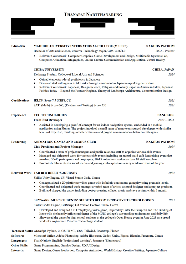 I am currently a senior-year student at Mahidol University International College. My major is Creative Technology. Here we study various types of media, including games, websites, mobile applications and more.